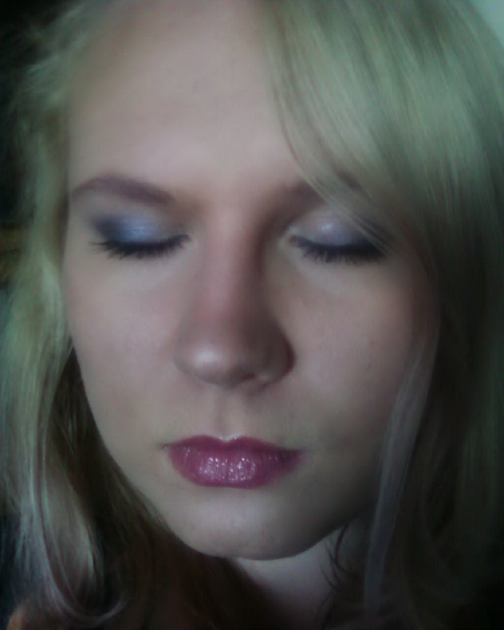 K tomu som zvolila fialový rúž, fialové líčka, obočie, tiene na oči aj ceruzku. Na fotke kde mám oblečené fialové tričko, ale nevidno dobre kontrast vlasov, preto som sa odfotila v mikine.